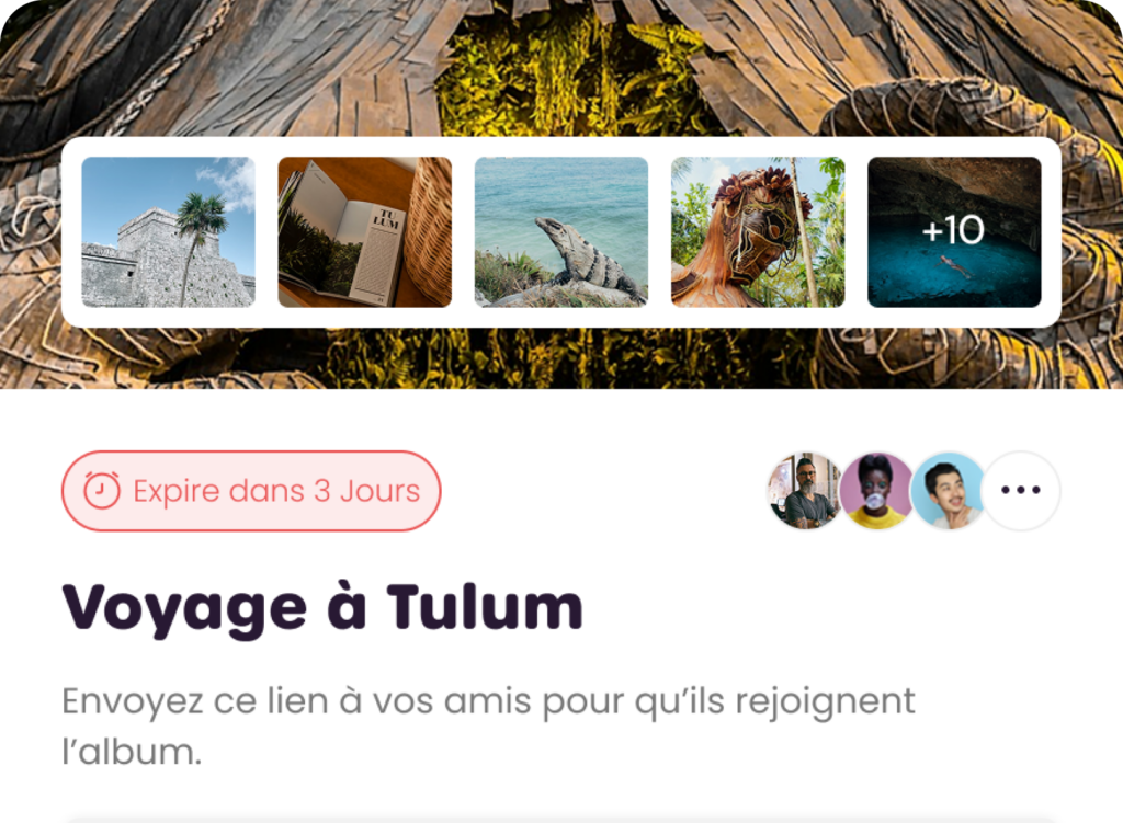 Vacances, week-ends, soirées… Créez un album temporaire, invitez tout le monde et récupérez toutes les photos en haute qualité.