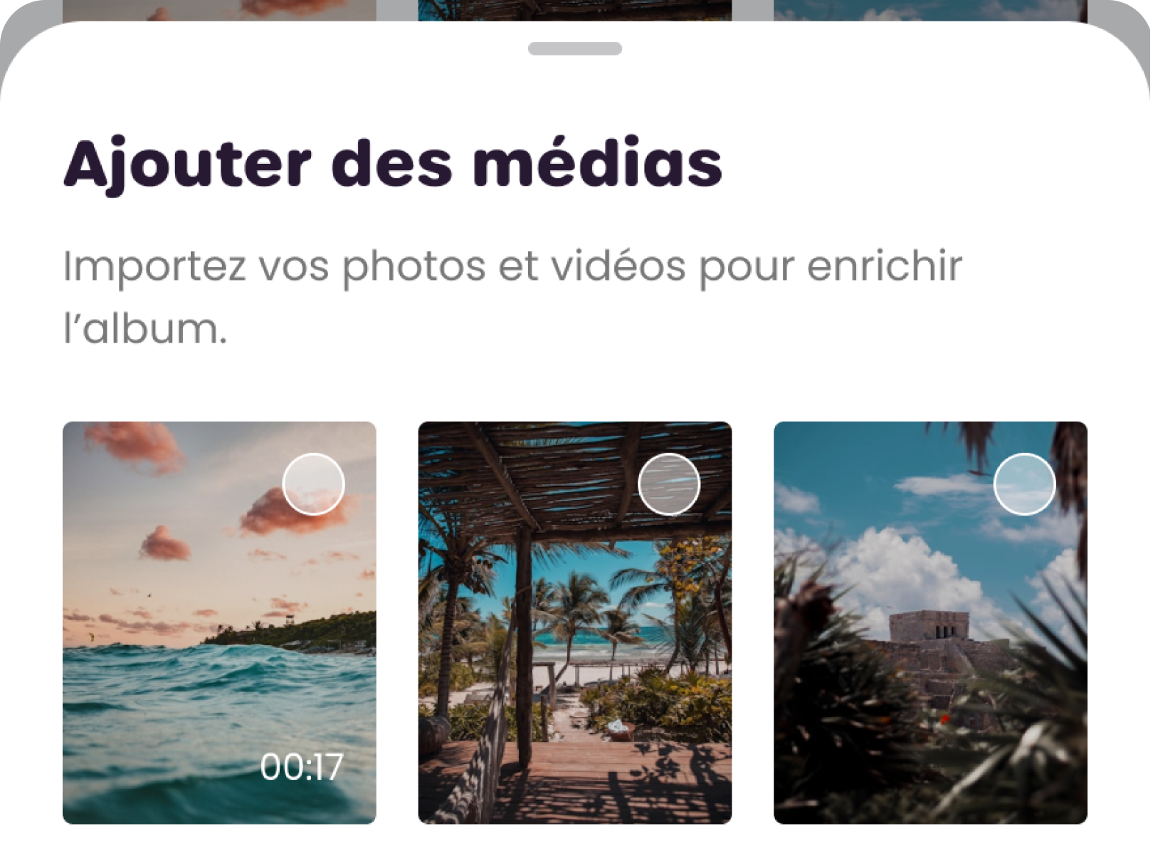 L’app vous guide naturellement : créez un album, invitez vos amis et commencez à partager en quelques secondes. Tout est fluide, clair et optimisé pour que vous vous concentriez sur vos souvenirs.
